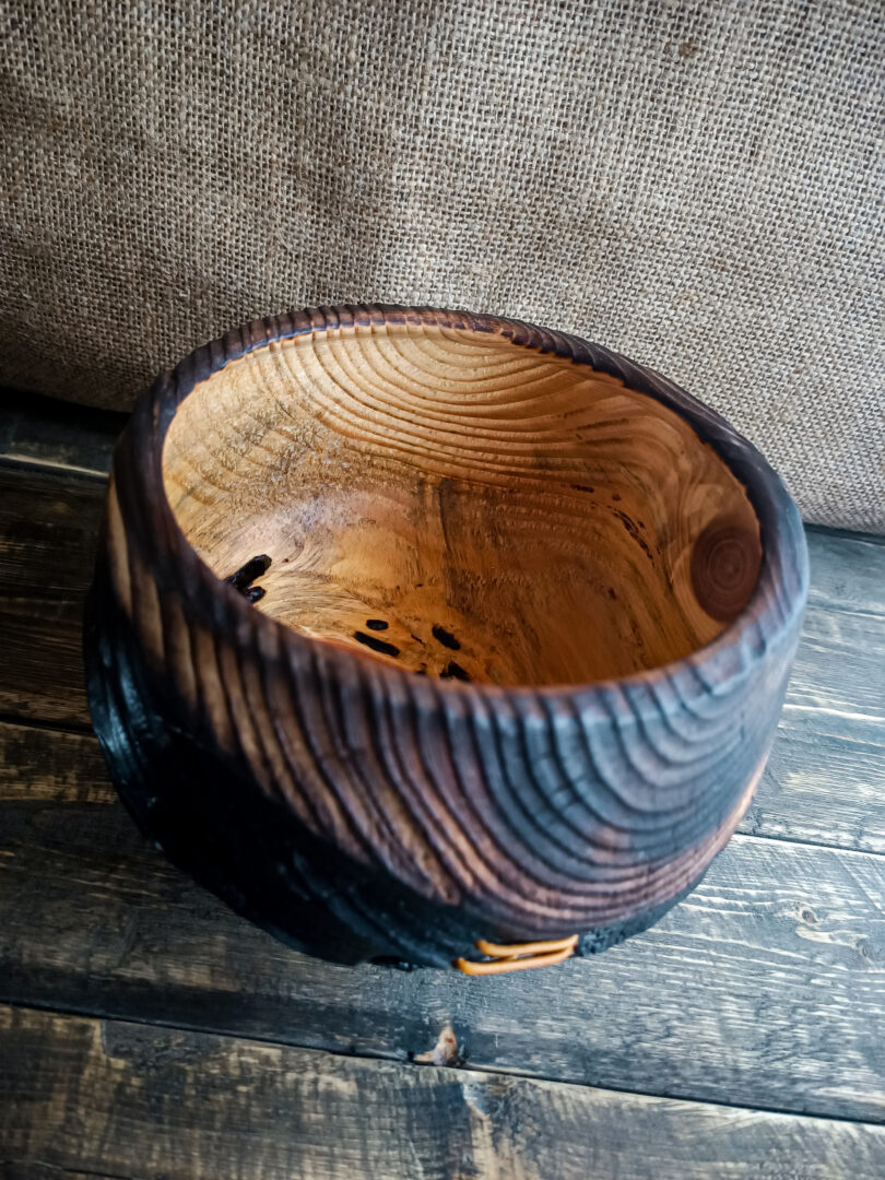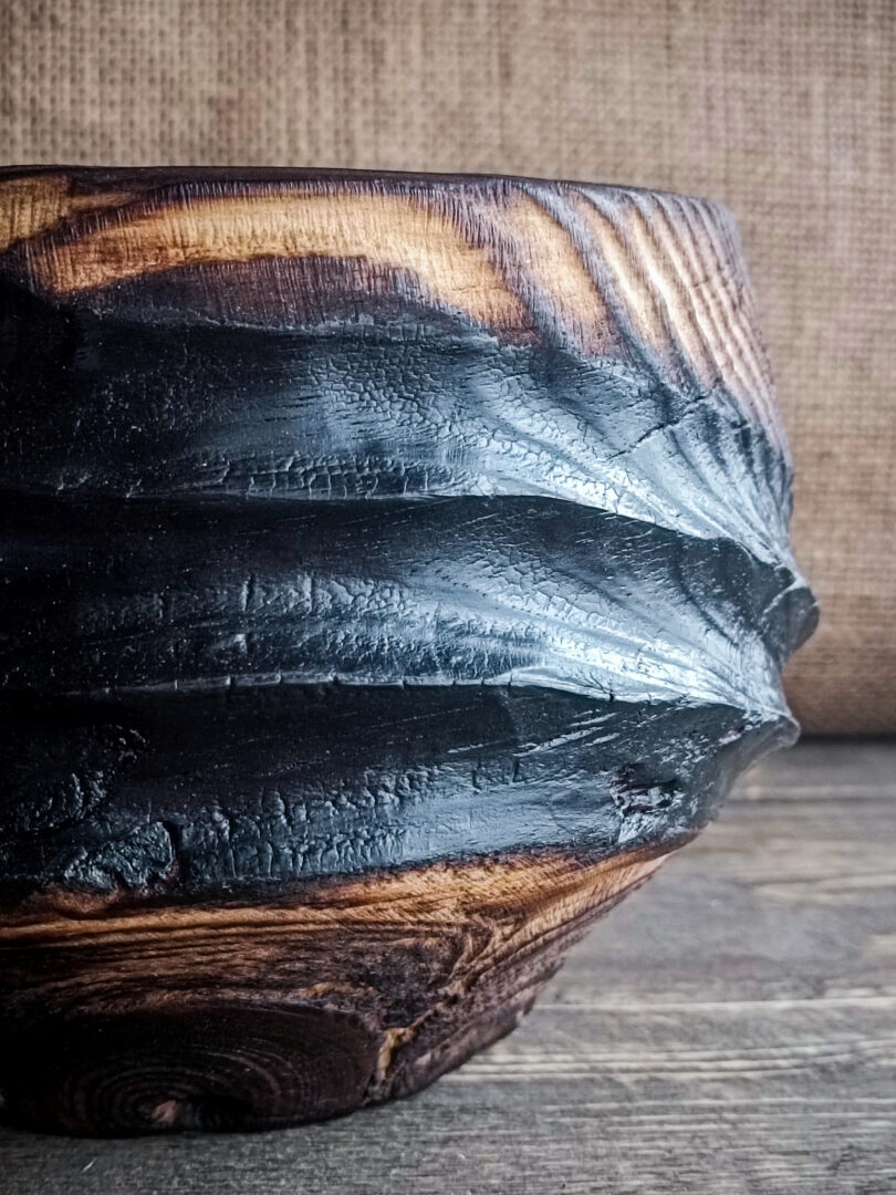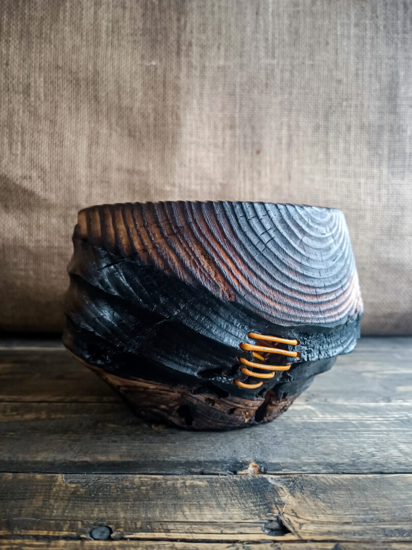 Arashi est un bol sculptural en sapin, brûlé selon la technique du yakisugi puis brossé. Sa forme organique et sa vague sculptée lui confèrent une présence forte, entre matière brute et mouvement.