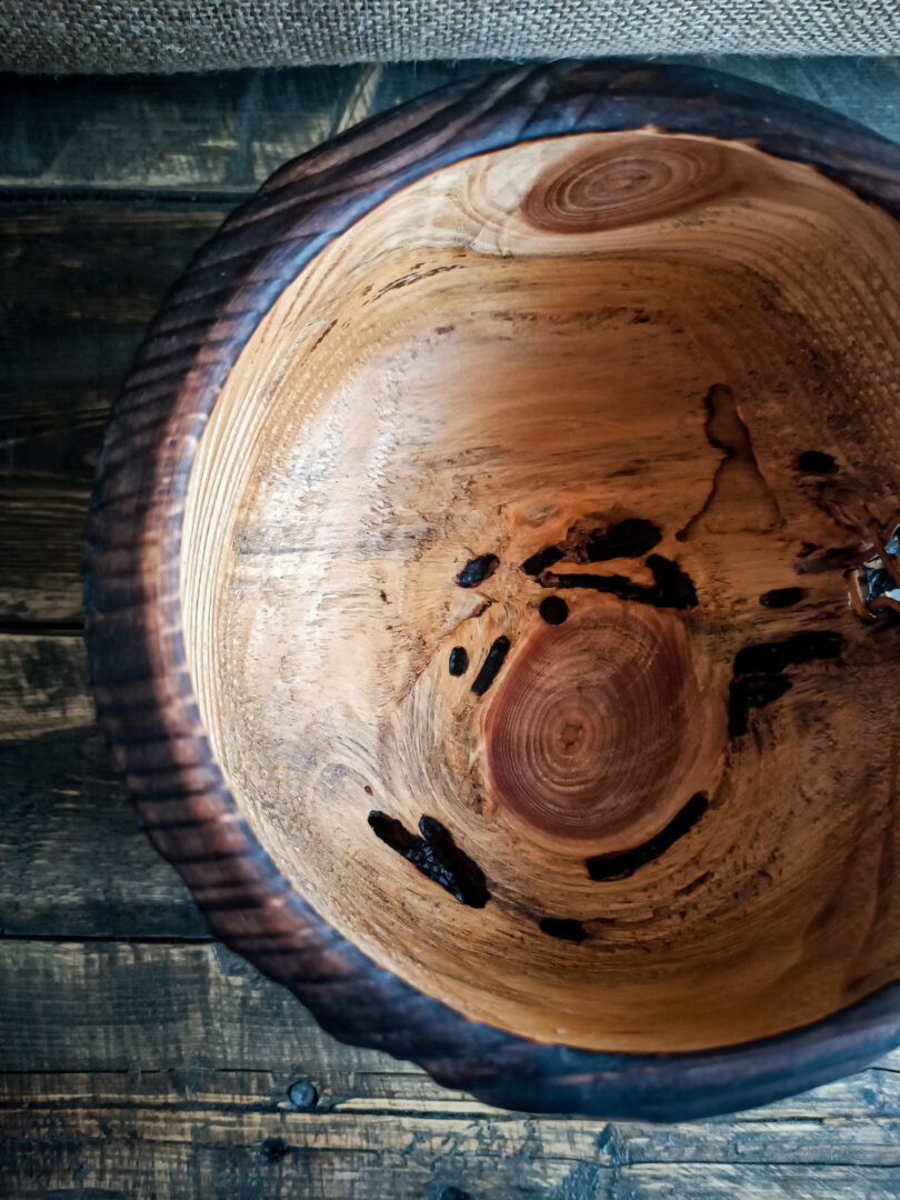 La forme du bol Arashi ne se limite pas à une fonction. Une vague sculptée traverse la pièce, comme un mouvement figé dans le bois. Cette ondulation a ensuite été retravaillée et rebrûlée, accentuant encore la profondeur et le contraste de la matière.