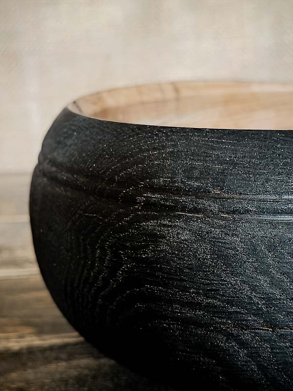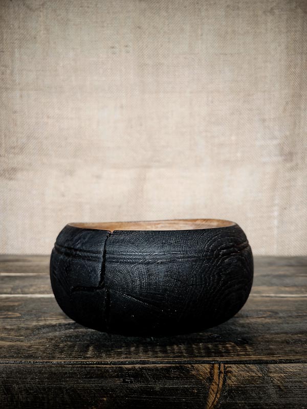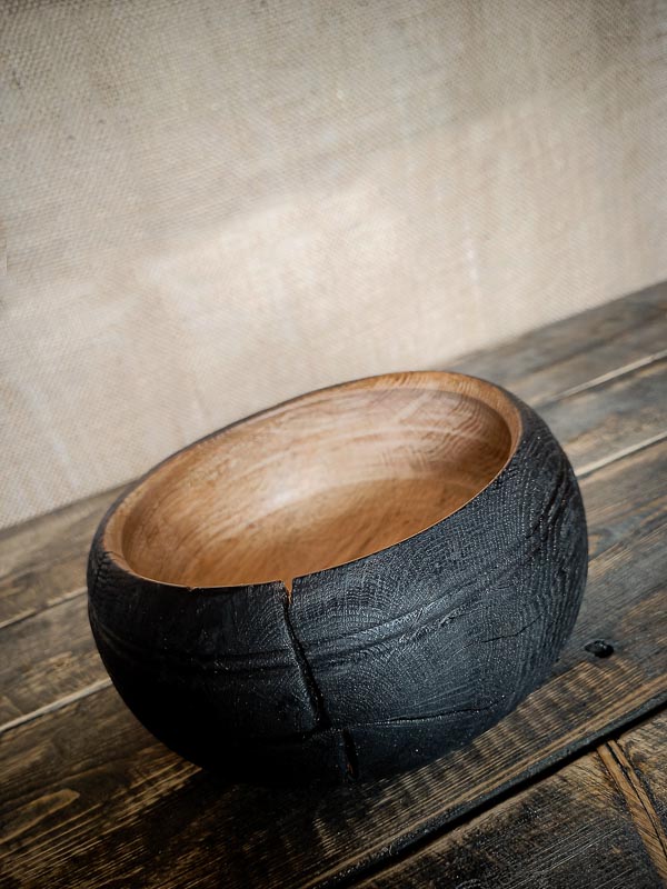 Bol sculpté en chêne, brûlé selon la méthode yakisugi et inspiré des bols à thé japonais. Wa-nari mêle sobriété, matière vivante et esthétique du wabi-sabi.
