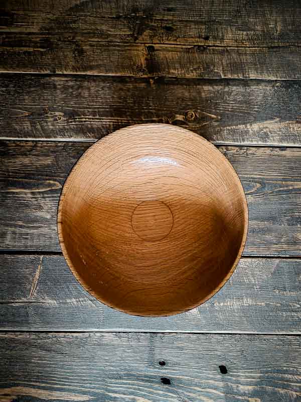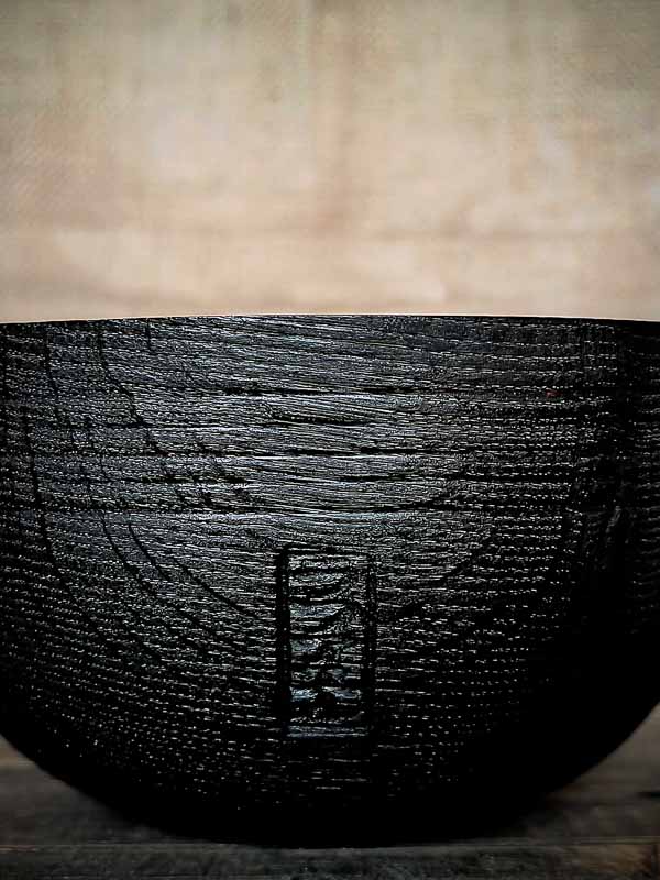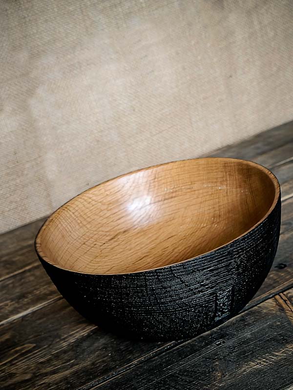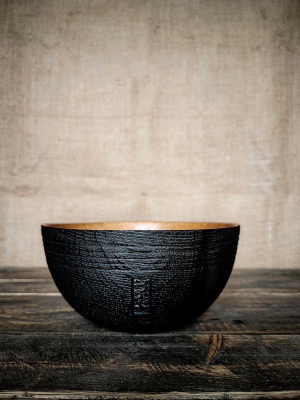 Bol en chêne tourné, brûlé à l’extérieur et laissé clair à l’intérieur. Wan-nari reprend les lignes épurées des bols de cérémonie japonais dans une pièce sculpturale et contemporaine.