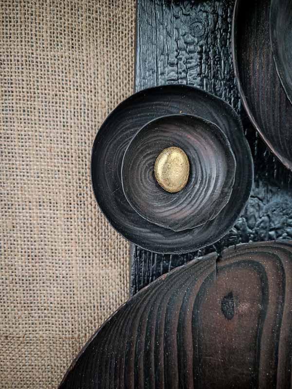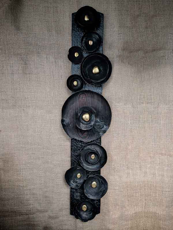 Asagao – littéralement « fleur du matin » en japonais – s’inspire de l’épanouissement fugace de la nature. Cette sculpture murale verticale associe l’érable à grain fin et le sapin aux cernes plus marqués, magnifiés par la technique du yakisugi, qui brûle le bois en surface pour en révéler chaque fibre. Les teintes sombres et les textures profondes créent un contraste saisissant avec les cœurs dorés, comme des pistils lumineux jaillissant de l’ombre.