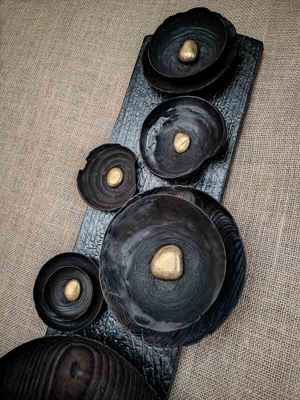 L’érable, pour ses nervures délicates, dialogue ici avec le sapin et sa force plus brute. Les creux, les fissures et les reliefs amplifiés par la combustion évoquent les aléas de la matière vivante : impermanence, transformation, beauté imparfaite. Asagao s’inscrit pleinement dans une esthétique wabi-sabi, où chaque irrégularité devient une richesse, chaque imperfection une marque de sincérité.
