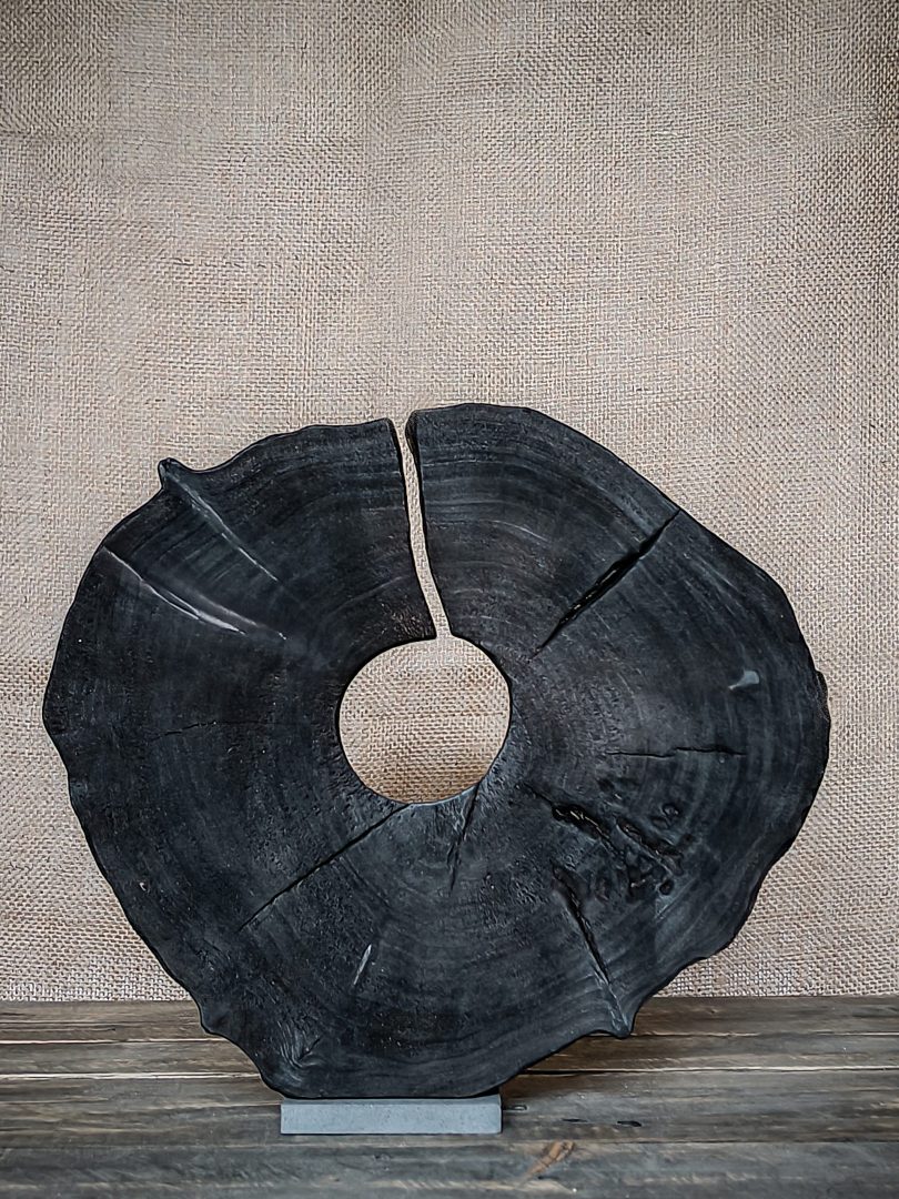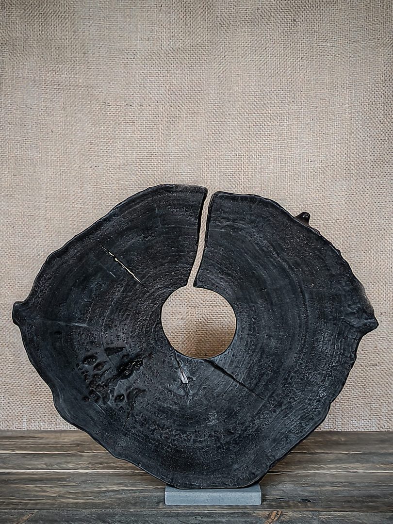 Sculpture en sapin brûlé représentant une coupe d’arbre percée et marquée de fentes naturelles. Iwami conjugue force brute et douceur circulaire dans une pièce organique saisissante.