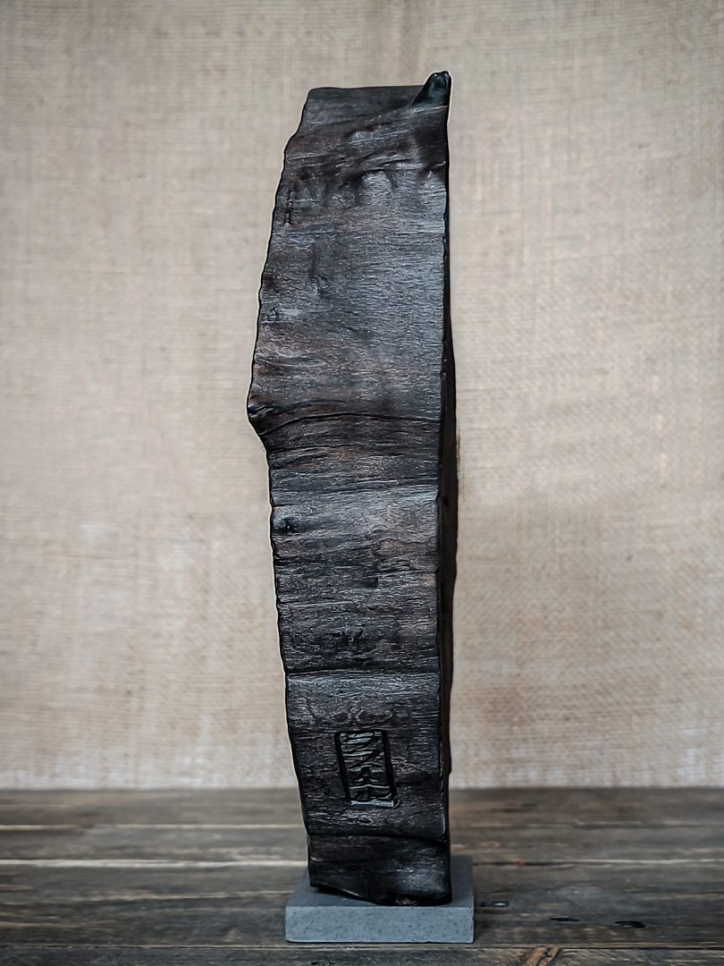 Les fentes qui marquent la sculpture ne sont ni accidentelles, ni corrigées. Elles ont été laissées telles quelles, voire accentuées dans leur présence, pour raconter la tension du bois, sa réaction au feu, sa résistance, ses limites. Ces fissures deviennent lignes de force. Elles inscrivent dans l’œuvre le souvenir d’un choc, d’un mouvement, d’un changement d’état.