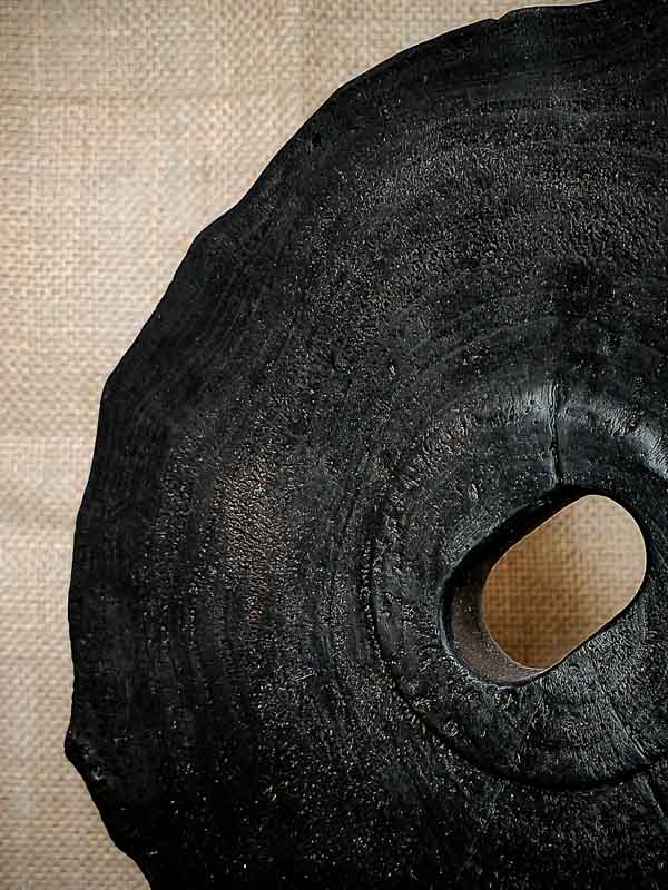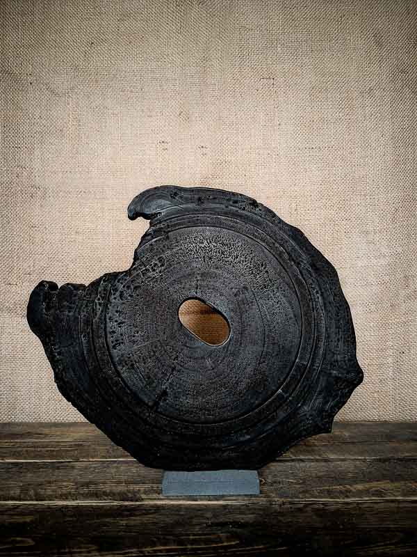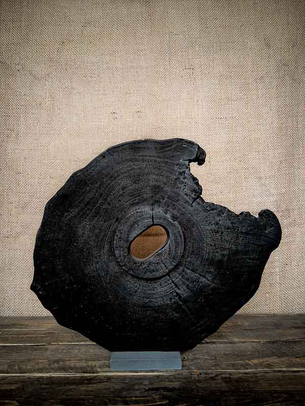 Nommée Iwami, cette sculpture en érable brûlé tire son nom d’une région japonaise façonnée par les éléments — une terre de contraste entre mer, montagne et feu. Ici, le bois porte cette même dualité. Sa forme de disque évoque les cycles naturels, les strates du temps, les coupes transversales de la vie.