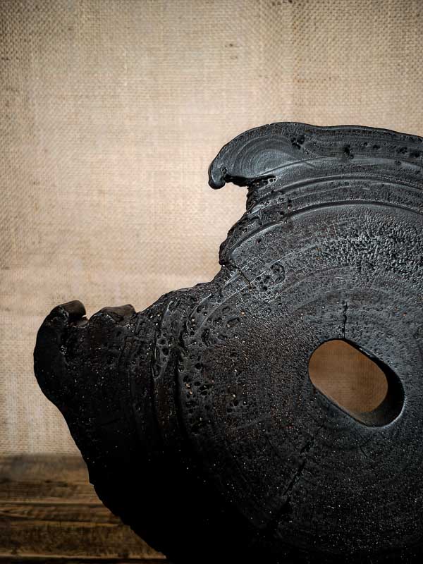 Ce qui frappe d’abord dans Iwami, c’est sa forme libre, presque instable visuellement. Le disque n’est pas régulier. Il semble usé, rongé par le temps, comme un fragment archéologique ou un objet que l’océan aurait sculpté.