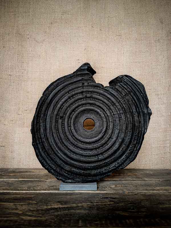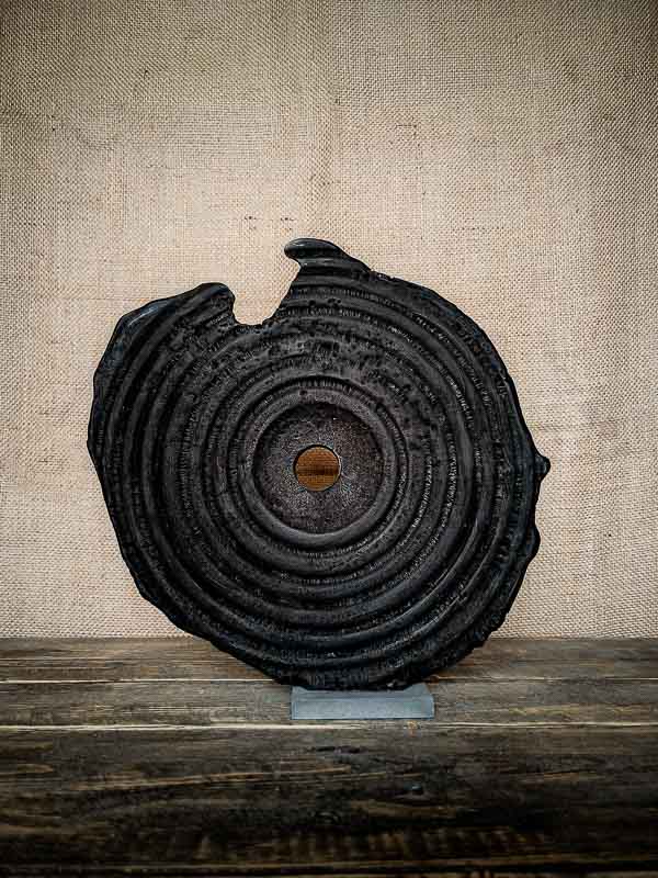 Légèrement irrégulière sur son pourtour, fendue par endroits, et pourtant structurée par ses cercles, Iwami parle d’équilibre. L’œuvre semble issue d’un monde archaïque, ou d’un futur lointain. Elle ne copie rien, elle affirme un langage brut.