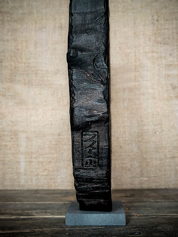 L’érable a été brûlé selon la méthode traditionnelle du yakisugi, afin de révéler toute sa profondeur. Le feu a creusé les veines du bois, fait naître des contrastes subtils, et amplifié les creux entre les cannelures.
