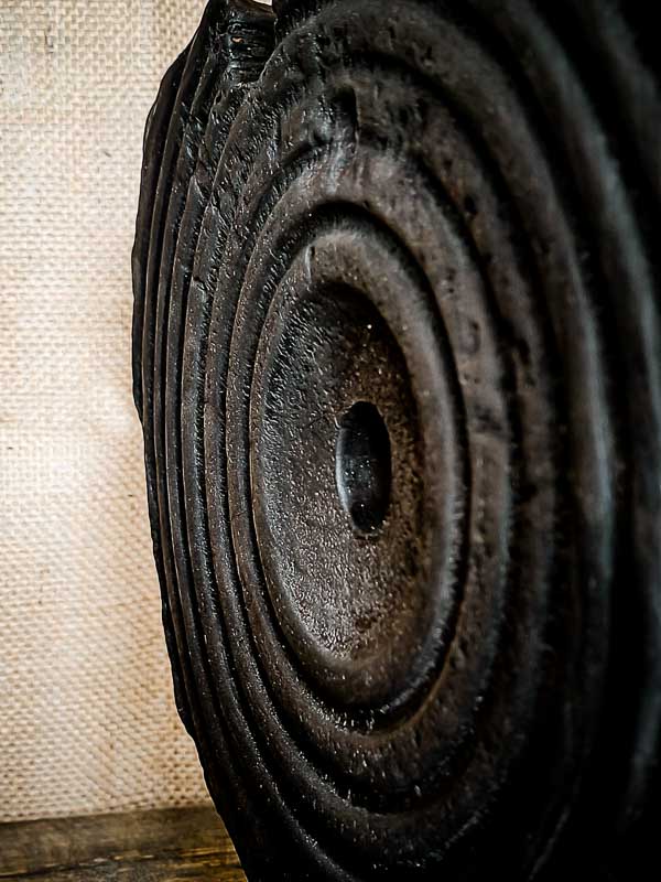 Ce motif, travaillé à la main, crée une dynamique visuelle puissante. Il attire l’œil vers le centre percé de la sculpture, comme une spirale calme ou un disque de résonance.