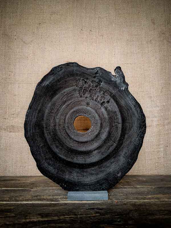 Son langage est celui du silence : le noir, le bois, la forme simple. Et pourtant, elle vibre. Elle évoque les éléments — la terre, le feu, l’écorce, la roche. Elle interroge le passage du temps, la mémoire contenue dans les cercles, les forces naturelles sculptées à même la matière.