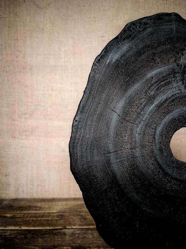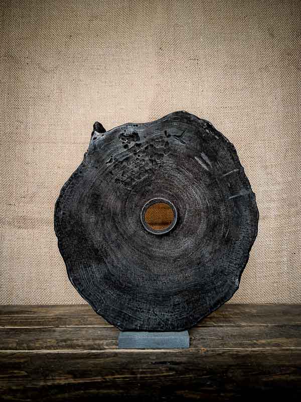 Sculpture en érable brûlé à l’aspect minéral, marquée de stries circulaires profondes. Iwami #05 explore la tension entre géométrie naturelle et intervention artisanale.