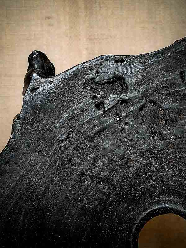 La sculpture a été entièrement traitée par yakisugi, technique traditionnelle de brûlage japonais. Cette méthode, utilisée ici de manière profonde, transforme la surface du bois en matière noire, mate, presque minérale.