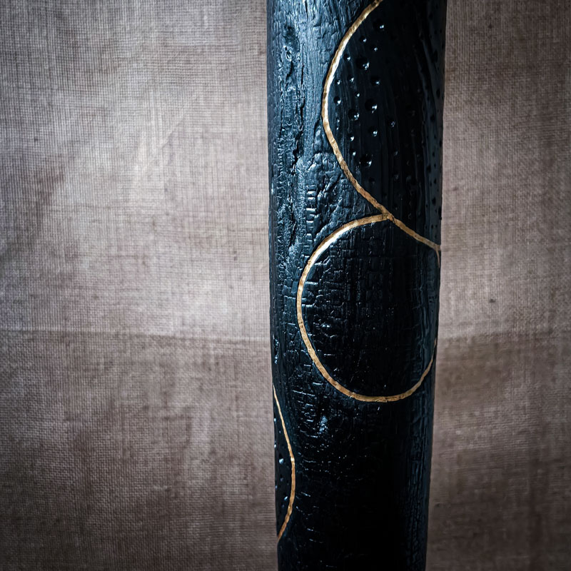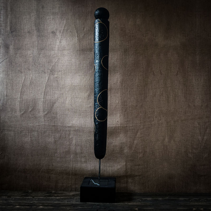 L’élément central de cette sculpture en bois noir réside dans ses motifs circulaires ou semi-circulaires gravés ou incisés sur sa surface. Ces motifs révèlent la couleur naturelle plus claire du bois sous la couche noire, créant un contraste visuel saisissant et une texture subtilement en relief. Le design des motifs apporte une touche d’originalité et de sophistication à cette pièce d’art en bois.