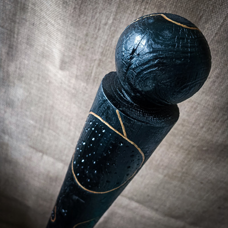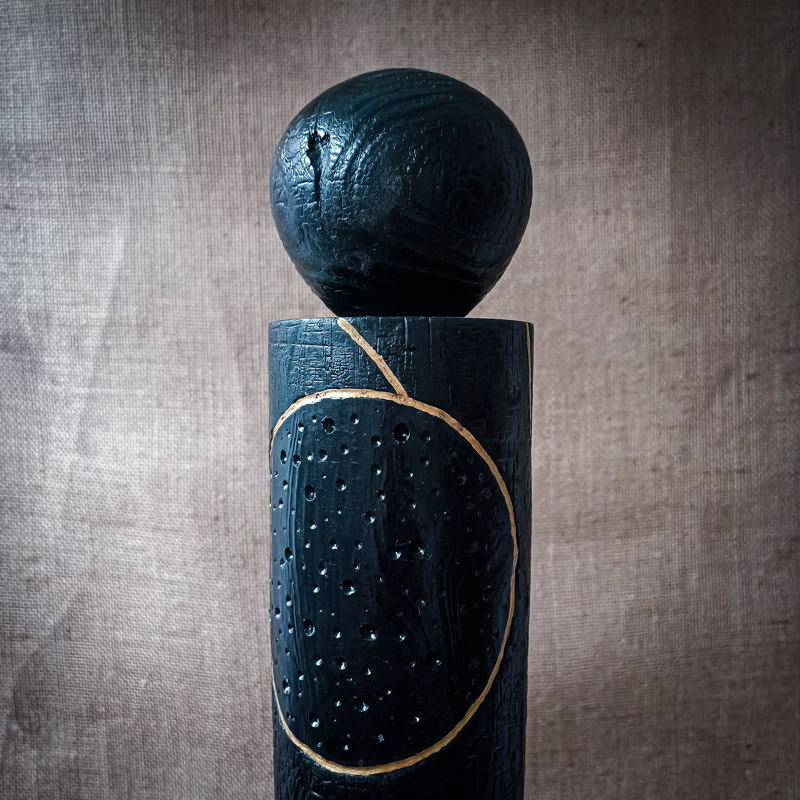 Le sommet de la sculpture est orné d’une sphère en bois noir, ajoutant une touche finale d’élégance et d’équilibre à l’ensemble. Ce détail simple mais significatif complète la forme générale de la sculpture et renforce son caractère artistique.