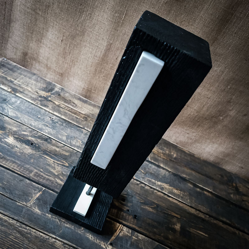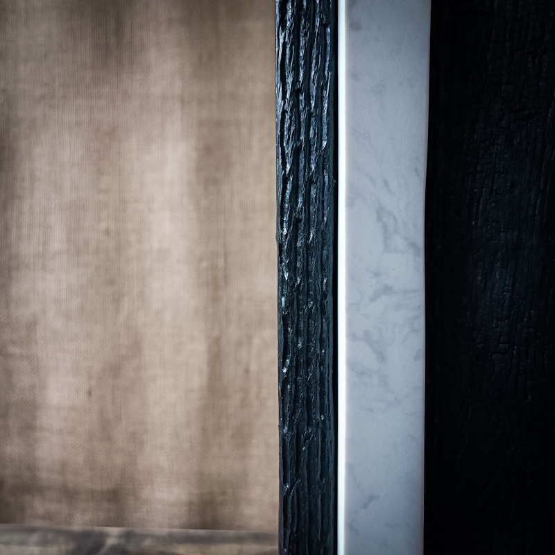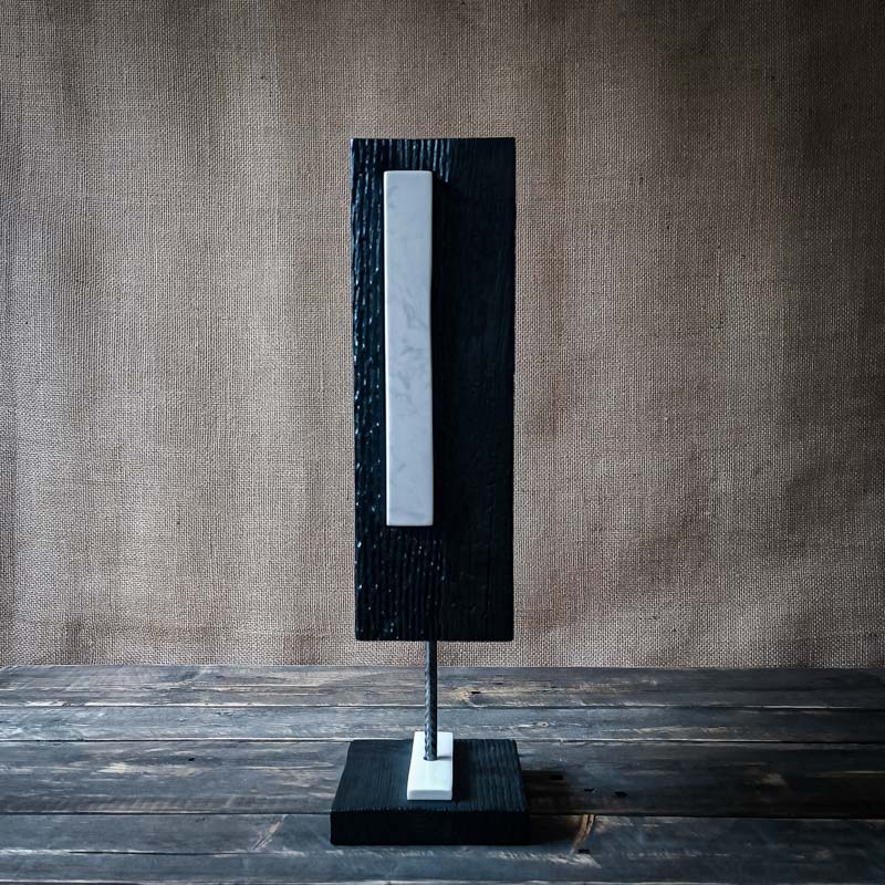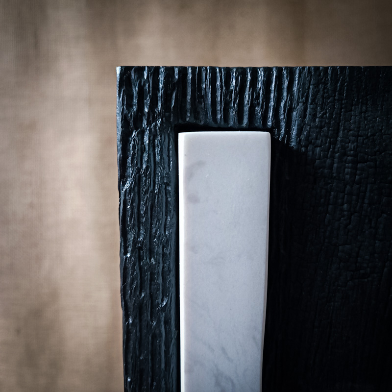 Cette œuvre d’art minimaliste incarne l’union entre la matière brute et la pureté des lignes. Le bois brûlé, travaillé avec précision, présente une texture profondément marquée qui capte la lumière et souligne l’intensité du noir. En contraste, l’éclat de marbre blanc s’élève avec sobriété, créant un jeu de dualité fascinant entre obscurité et clarté, rugosité et douceur.