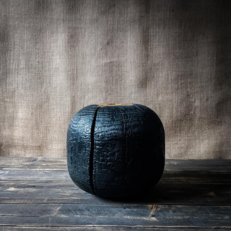Lava est un vase sculptural en sapin, brûlé selon la technique traditionnelle du yakisugi, dont les fêlures naturelles sont magnifiées par une dorure délicate à la feuille. Une pièce unique, à la fois brute et éclatante.