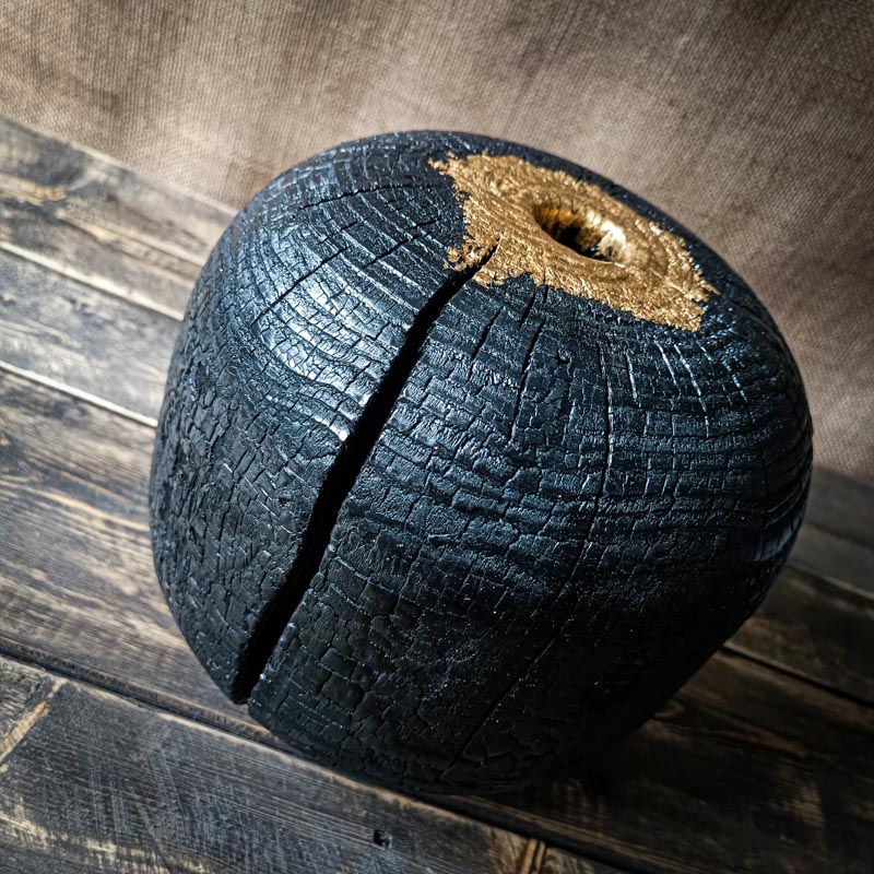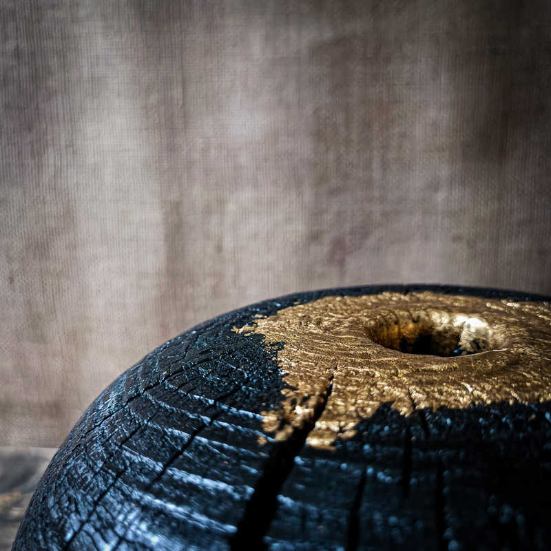 Au sommet de Lava, l’ouverture a été soigneusement travaillée. Une dorure à la feuille, délicatement appliquée à la main, vient illuminer la pièce. L’or s’immisce dans les reliefs du bois calciné, accrochant la lumière et créant un contraste saisissant avec le noir profond de la surface brûlée.