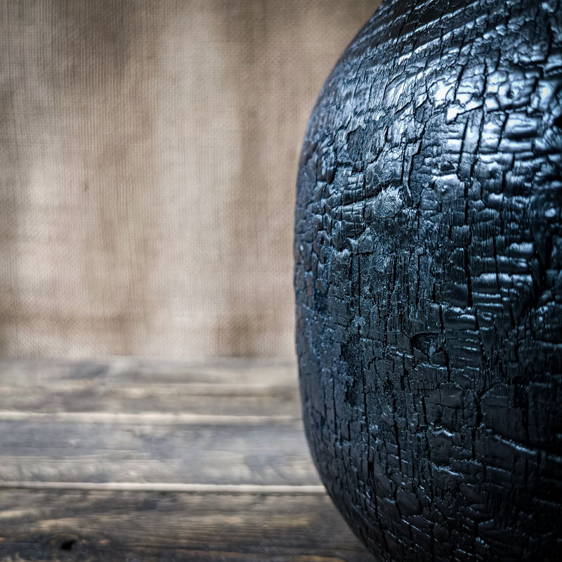 Avec Lava, la matière s’exprime sans retenue. Ce vase monumental a été tourné dans un imposant bloc de sapin, puis transformé par le feu selon la méthode ancestrale du yakisugi. Ce brûlage profond ne se limite pas à noircir le bois : il en révèle la texture cachée, il exacerbe les lignes, il force les craquelures à naître. Sous l’effet de la chaleur, le bois s’est ouvert de lui-même, sculptant une fente impressionnante qui semble surgir des entrailles de la matière.