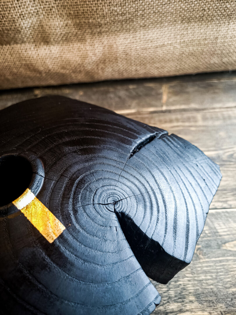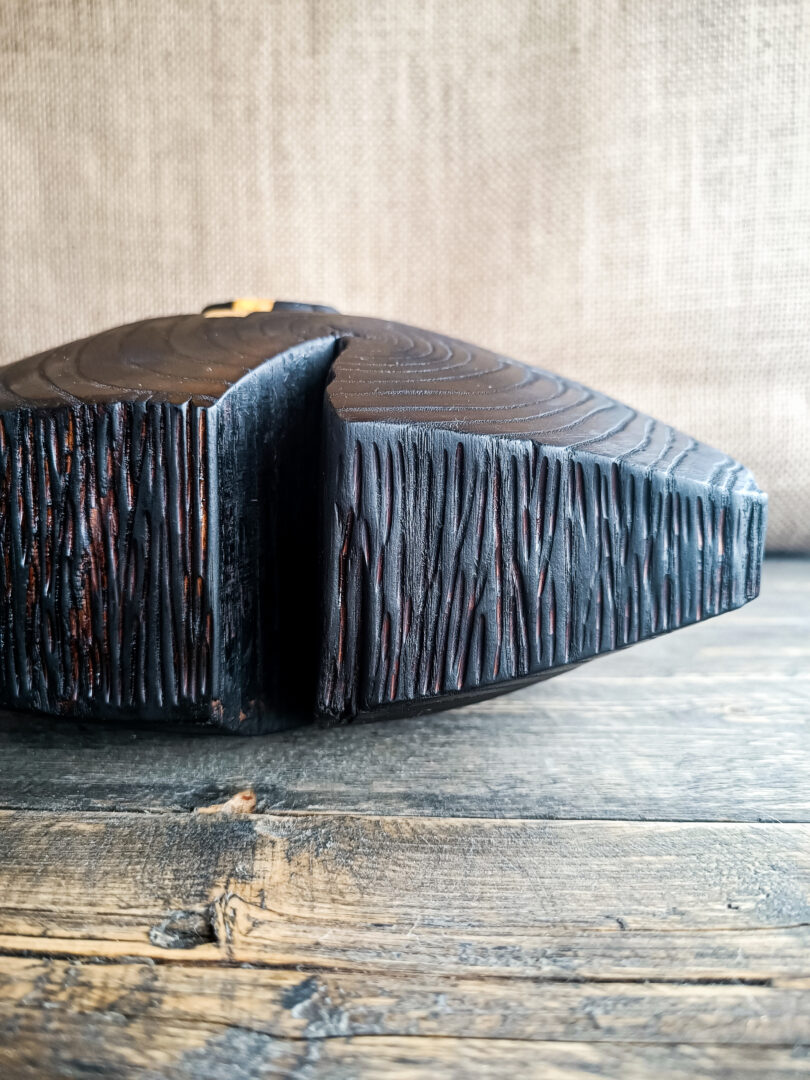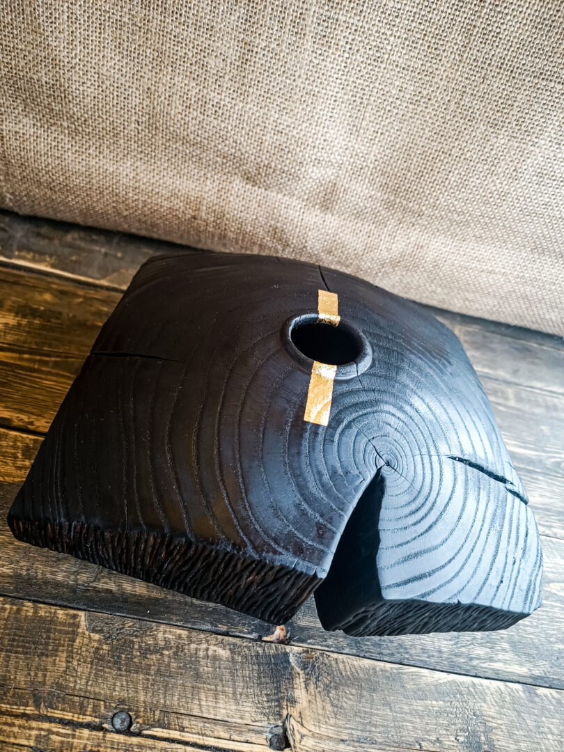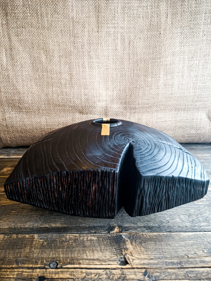 Réalisé en chêne, le vase Asama a été façonné puis transformé par la technique du yakisugi. Le bois a été brûlé en surface, puis travaillé pour révéler toute la richesse de son veinage. Les cernes apparaissent avec précision, dessinant une cartographie naturelle autour de l’ouverture centrale.