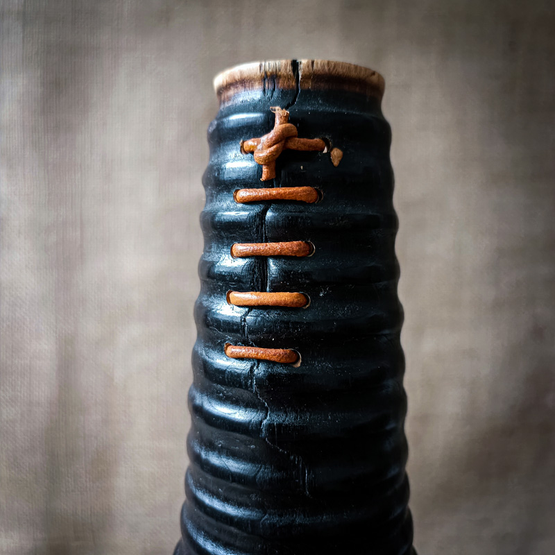Vase en pommier brûlé, sublimé par des stries tournées et une couture en cuir naturel. Alternance révèle la beauté des cicatrices, entre force et poésie brute. Une œuvre unique et vibrante, pour un intérieur qui a du sens.