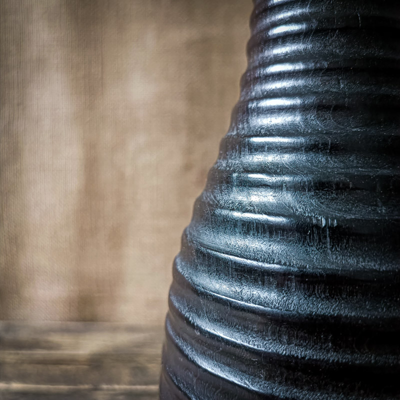 Le choix du bois de pommier n’est pas anodin. D’apparence douce, ce bois dense et nerveux recèle une énergie insoupçonnée. Sa structure serrée permet un travail précis et révèle des textures riches, surtout après la brûlure. Sous l’action du feu, les cernes du pommier se creusent et s’accentuent, offrant une alternance régulière de crêtes et de vallées, à l’origine du nom de ce vase unique.