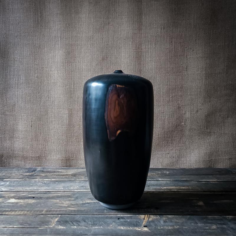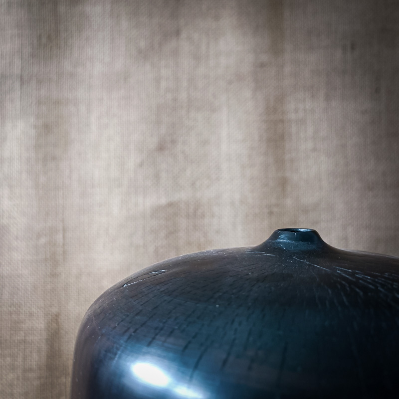 La surface, soigneusement polie, présente un noir profond, obtenu par un brûlage maîtrisé. L’aspect satiné renforce l’épure de l’ensemble, tout en donnant à l’objet une présence forte.