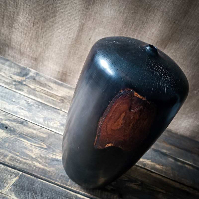 Ce vase noir en bois brûlé célèbre la matière telle qu’elle est, avec ses contrastes et ses surprises. L’inclusion n’est pas une imperfection : c’est un détail vivant, une mémoire du végétal.