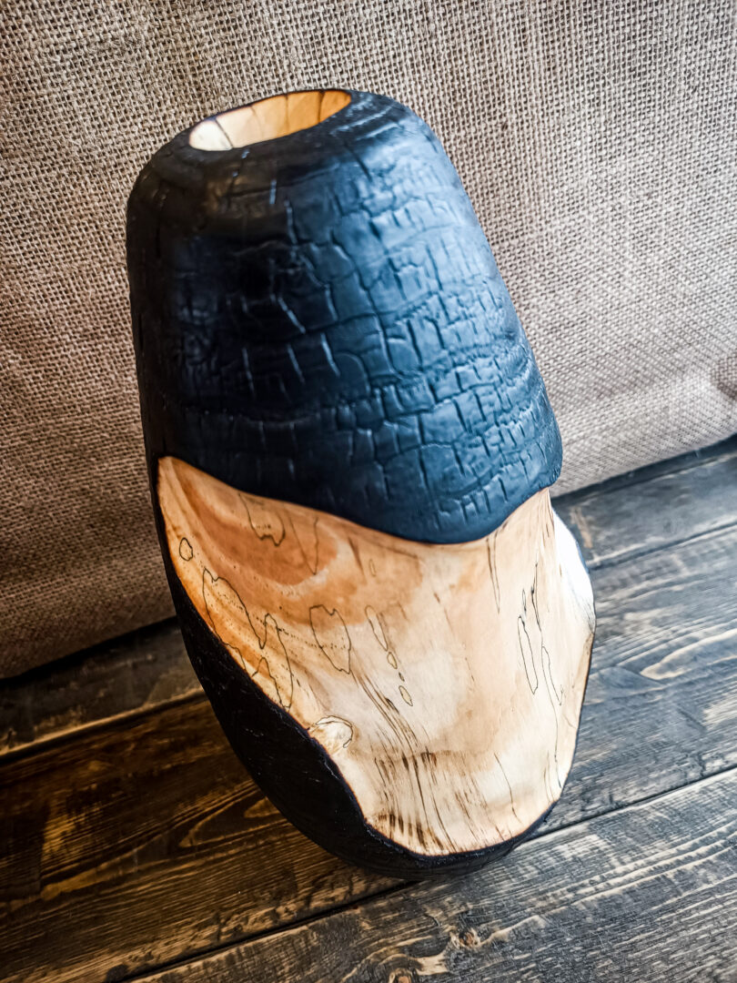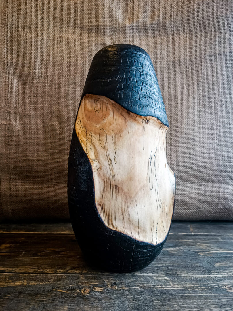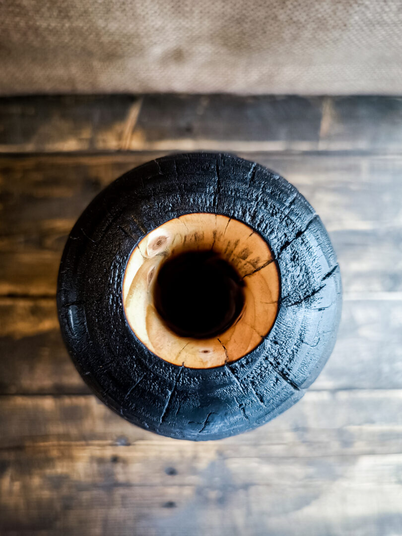 Le vase Hifu est réalisé en sapin échauffé, une essence déjà marquée par des variations naturelles riches. La pièce a d’abord été entièrement brûlée selon une approche inspirée du yakisugi, créant une surface noire profonde, texturée et protectrice.