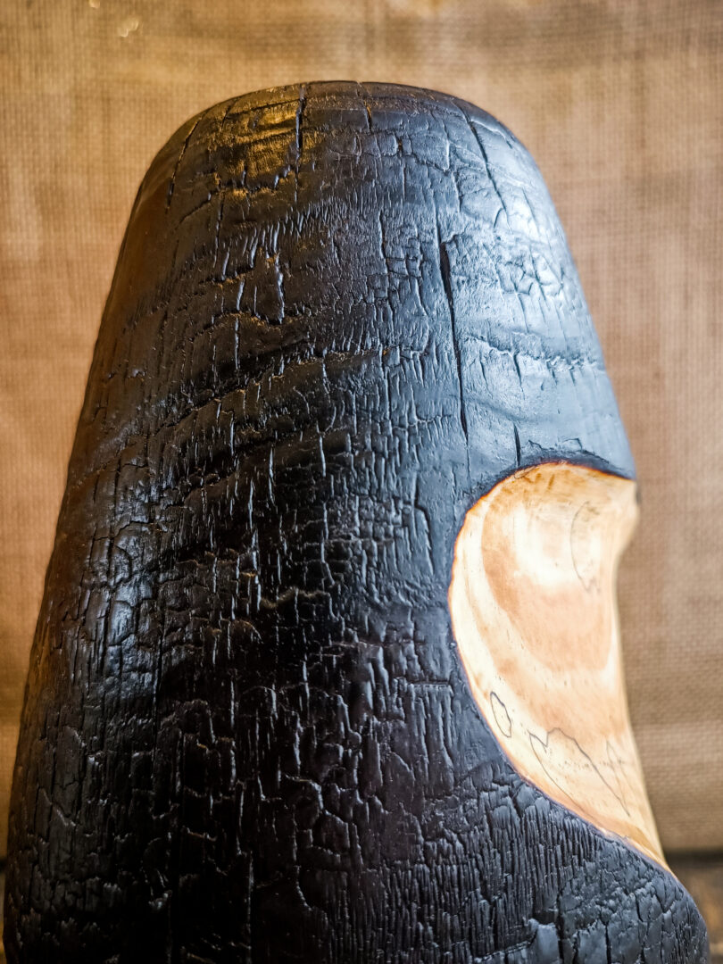 Après le brûlage complet, une partie de la surface a été sculptée à la main pour revenir à la matière brute. Ce geste de soustraction vient révéler le cœur du bois, plus clair, plus vivant, contrastant fortement avec les zones noircies.