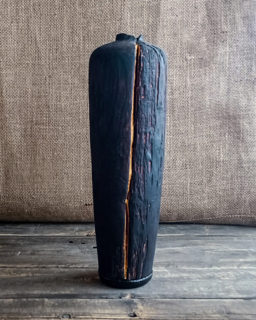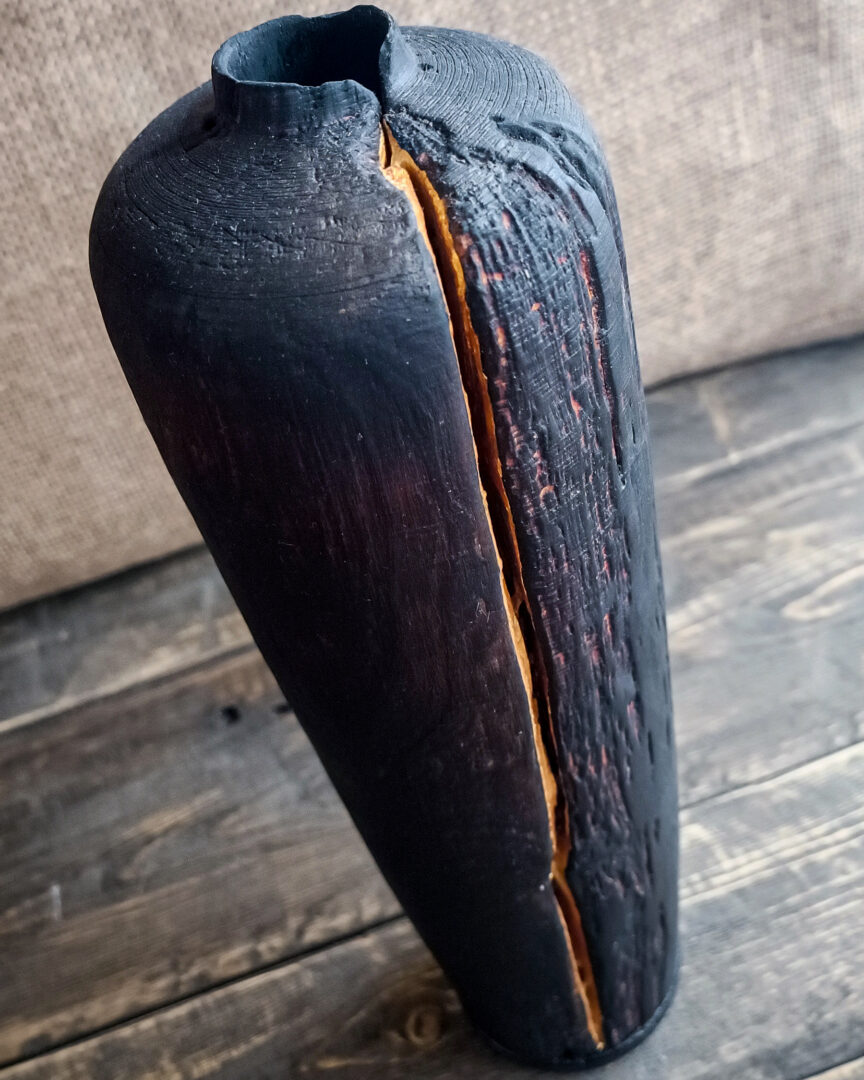 Kagoshima est un vase en saule massif, travaillée selon la technique du yakisugi. Sa surface brûlée révèle une matière profonde, traversée par une ligne dorée peinte qui sublime la fissure naturelle du bois. Une œuvre à la présence forte et méditative.