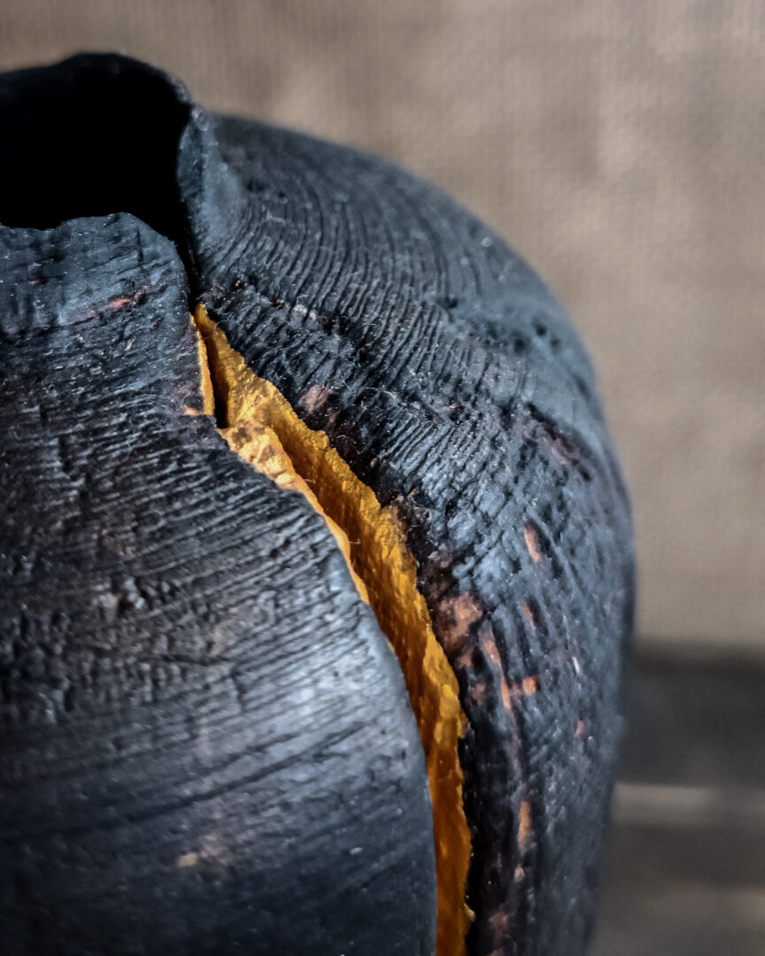 Ce geste évoque l’esprit du kintsugi japonais, où la fracture devient élément de beauté. Ici, la dorure ne cherche pas à réparer, mais à célébrer. Elle crée un contraste lumineux au cœur du noir profond.