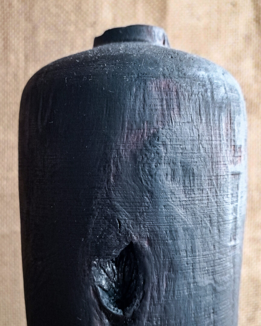 Le noir profond obtenu par carbonisation contraste avec les reliefs plus doux laissés par le travail de sculpture. Le bois n’est pas lissé à l’excès : il est respecté. Les irrégularités, les creux et les aspérités témoignent du dialogue entre la flamme et la fibre.