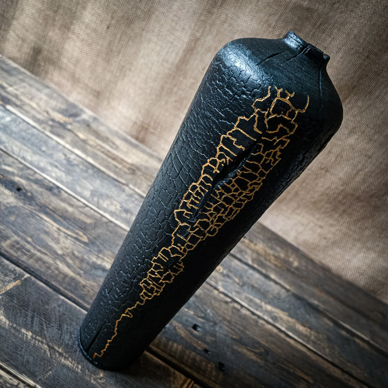 Le contraste entre la surface noire craquelée et la ligne dorée apporte une profondeur visuelle et une tension artistique à l’ensemble. Cette dichotomie évoque les forces naturelles opposées – le feu et la matière, la destruction et la création, l’ombre et la lumière. Chaque fissure est unique, chaque reflet doré change avec la lumière du jour, faisant de « Kyoto » une œuvre vivante, évolutive et sensible à son environnement.