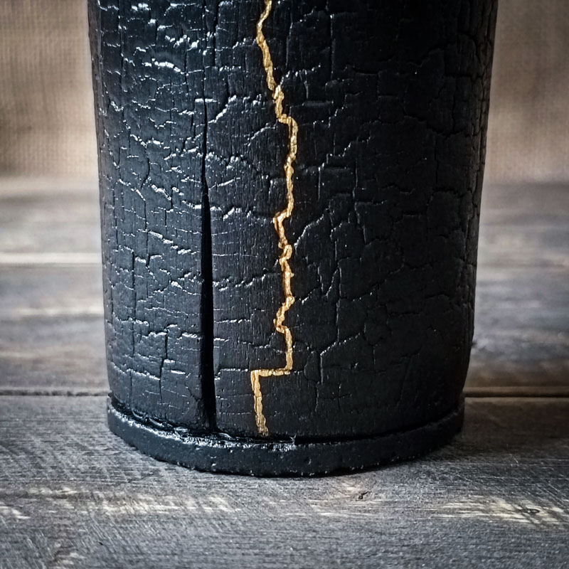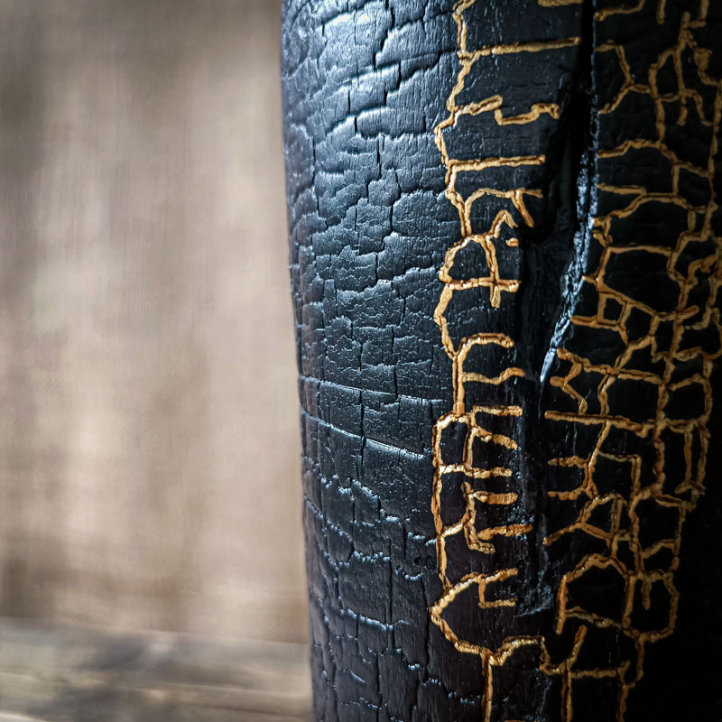 Le yakisugi (ou shou sugi ban), est une méthode traditionnelle japonaise consistant à brûler la surface du bois afin d’en améliorer la durabilité et la résistance aux éléments. Mais au-delà de ses qualités techniques, cette technique sublime la matière. Sous l’action du feu, le bois révèle des textures profondes, des craquelures élégantes et une teinte noire charbonneuse intensément graphique. Sur « Kyoto », cette noirceur est mise en valeur par une ligne dorée irrégulière, comme une faille lumineuse, une cicatrice précieuse qui traverse la pièce de haut en bas. Cette ligne évoque le kintsugi, l’art japonais de réparer les objets brisés avec de l’or, conférant à l’imperfection un statut d’esthétique suprême.