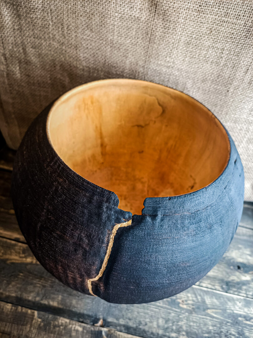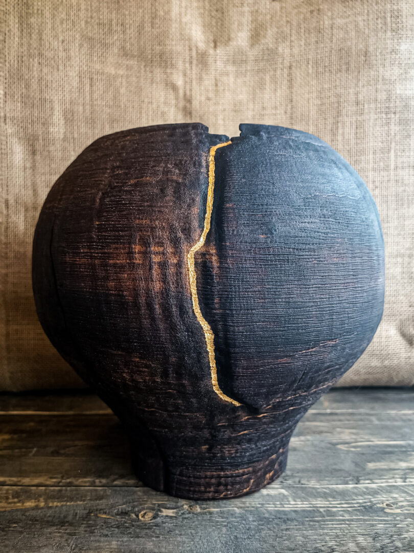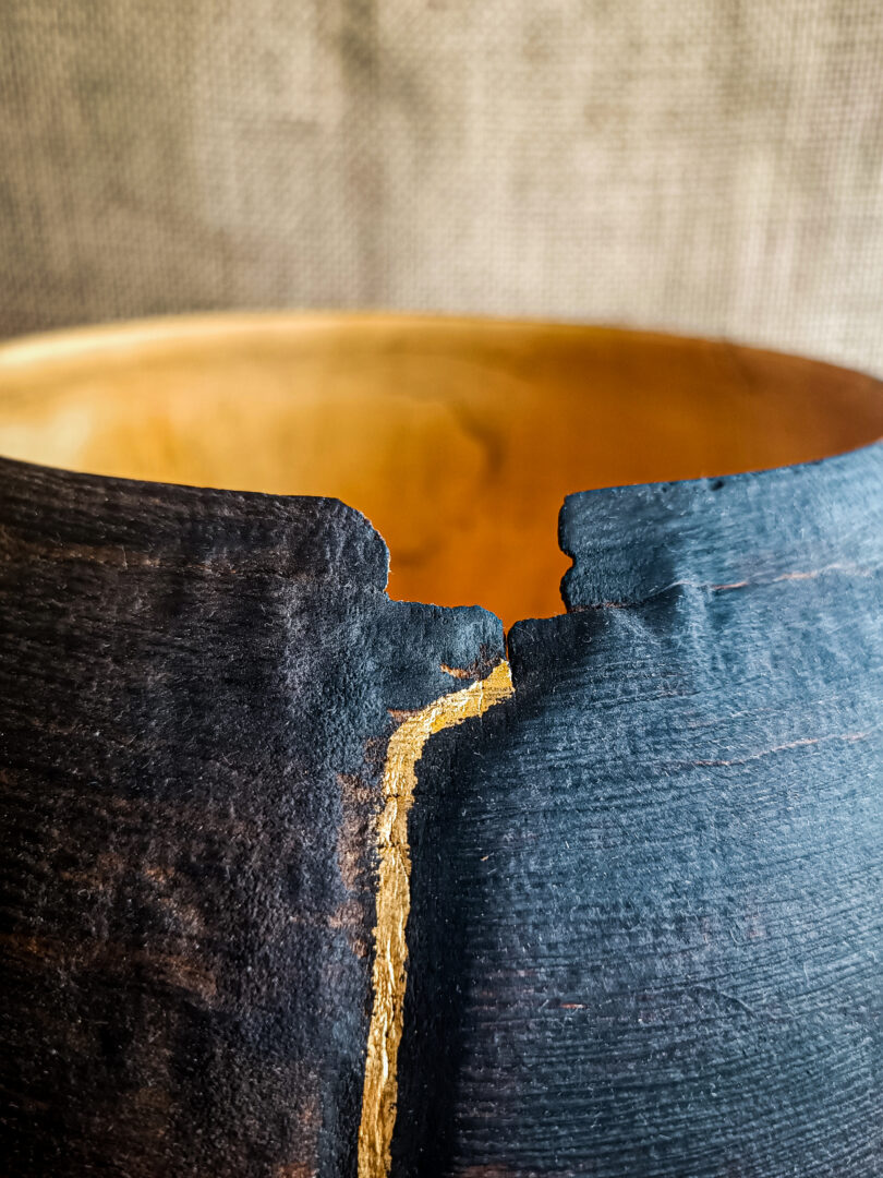 Inspirée du kintsugi, cette intervention transforme la fragilité en force. La lumière se capte sur cette ligne dorée, créant un contraste subtil avec le bois brûlé. Elle devient un élément central de la composition, une ligne de vie inscrite dans la matière.