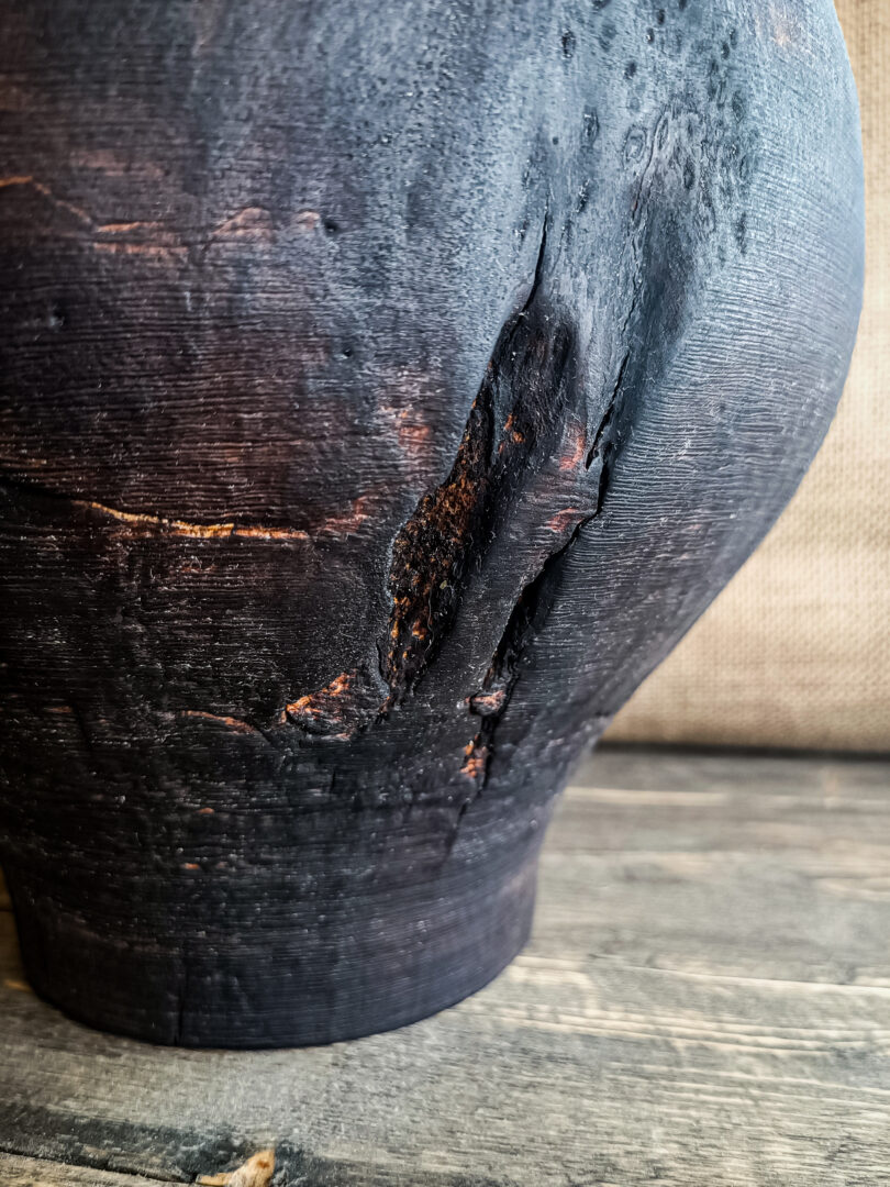 Le vase Matsutake est réalisé en érable, une essence fine dont le grain se révèle avec précision après transformation. La pièce a été brûlée selon une approche inspirée du yakisugi, puis brossée à la brosse métallique afin de faire ressortir les fibres du bois.