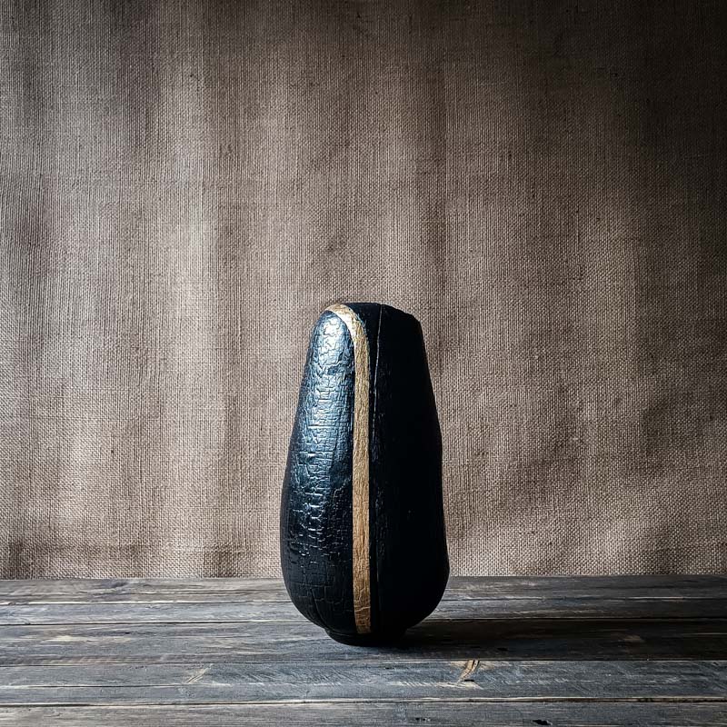 « Siena » est un vase en bois brûlé, traversé par une bande verticale en feuille d’or. Une sculpture minimaliste à la présence forte et lumineuse.