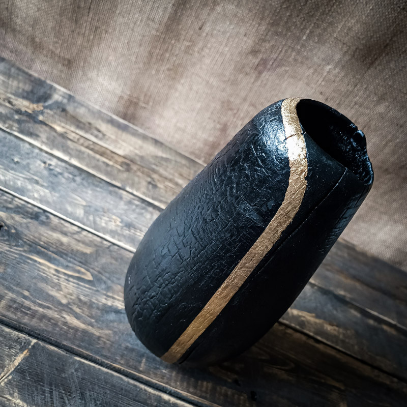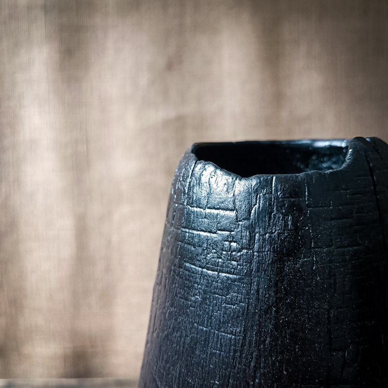 Ce vase en bois brûlé avec feuille d’or n’imite rien. Il affirme sa matière, son feu, sa texture. Il assume pleinement son caractère brut, tout en laissant place à la délicatesse du geste doré.
