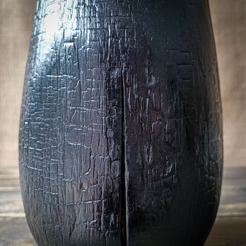 Le bois de sapin a été soigneusement brûlé. Ce traitement par le feu crée une surface craquelée, tactile, marquée par le passage du temps. Chaque craquelure, chaque variation de noir témoigne d’un processus naturel maîtrisé.